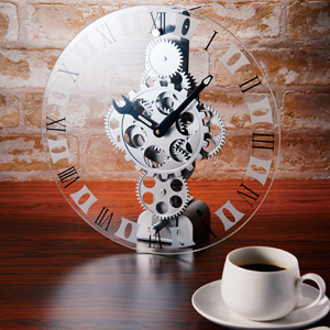12,800円 大小さまざまの十数個はある歯車が噛み合いながらまわり、時を刻みます。文字盤はガラス張りで中の様子が存分に楽しめ、その動きと不思議なデザインにふと時間がたつのを忘れてしまいそう。映画のメカニカルな世界で見たことがあるようなギアクロック。インテリアのポイントになること間違いなしです。